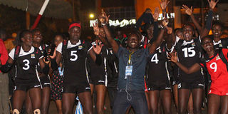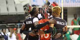 Malkia Strikers players celebrate a point during their Olympics qualifier against Cameroon at Palais polyvalent des sports (Paposy) Arena in Yaounde on January 7, 2020. PHOTO | SAMUEL GACHARIRA | NATION MEDIA GROUP