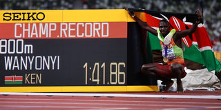 Kenya's Emmanuel Wanyonyi celebrates after winning gold in the men's 800m at the World Athletics Championships in Tokyo on September 20, 2025.