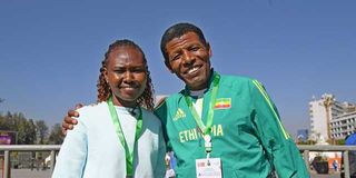 Ethiopia's athletics legend Haile Gebresslasie (right) and the women's marathon record holder Ruth Chepngetich (left), pose for a picture in Addis Ababa, Ethiopia on November 17, 2024.