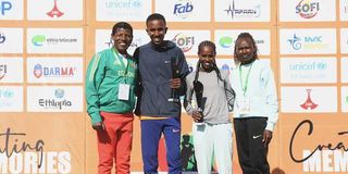 Ethiopia's athletics legend Haile Gebresslasie (left) and the women's marathon record holder Ruth Chepng'etich (right), poses for a picture with the Great Ethiopian Run 10km winners Biniam Mehary (men) and Asayech Ayichew (women) on November 17, 2024 in Addis Ababa, Ethiopia.