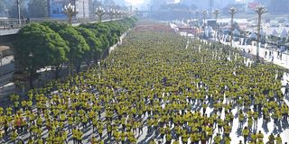 An aeral shot of runners taking part in the 24th edition of the Great Ethiopian Run 10km road race on November 17, 2024 in Addis Ababa.