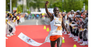 Kenya's Geoffrey Kamworor celebrates after winning the Grand Prix de Berne 10 miles race in Switzerland on May 11, 2019.