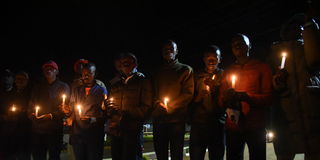 Elgeyo Marakwet County Chief Executive Committee for Sports Purity Koima joins local and foreign athletes to light candles outside the County Governor's office in Iten, Elgeyo Marakwet County on February 18, 2024 night to mourn the death of Kelvin Kiptum, the Marathon World Record Holder and his coach Gervais Hakizimana who were involved in a road crash at Flax on the Eldoret-Kaptagat-Eldama Ravine road a week ago.