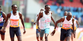 The 2022 World Under-20 champion Reynold Kipkorir (left) wins the men's 1,500m in a photo-finish at the Kenyan trials for the 2025 World Athletics Championships at Ulinzi Sports Complex, Nairobi on July 22, 2025.