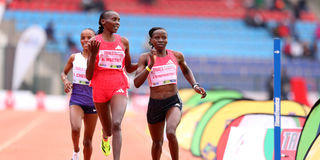 From left, Beatrice Chebet, Agnes Ngétich and Janeth Chepng’etich take part in the women's 10,000m of the Kenyan trials for the 2025 World Athletics Championships at Ulinzi Sports Complex, Nairobi, on July 22, 2025.