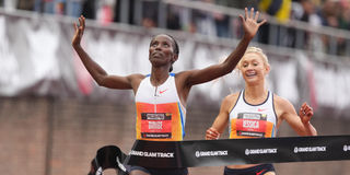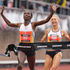 Diribe Welteji of Ethiopia crosses the finish line ahead of Jessica Hull of Australia in the women's 1,500m race during the Grand Slam Track Philadelphia at Franklin Field on May 31, 2025; Philadelphia, USA.