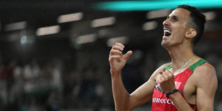 Morocco's Soufiane El Bakkali celebrates winning the men's 3000m steeplechase final during the World Athletics Championships at the National Athletics Centre in Budapest on August 22, 2023.
