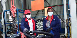 Isuzu D-Max Brand Ambassador and World Marathon Record Holder Eliud Kipchoge(left) and Isuzu East Africa MD Rita Kavashe on October 22, 2020 during the tour of the Isuzu D-Max production and assembly line and signing of a new two-year partnership agreement with Isuzu.