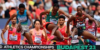 India's Avinash Mukund Sable, Ethiopia's Getnet Wale, Kenya's Simon Kiprop Koech, and other athletes compete in the Men's 3000m steeplechase heats during the World Athletics Championships at the National Athletics Centre in Budapest on August 19, 2023.