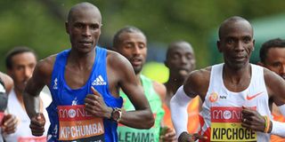 Kenya's Vincent Kipchumba (left) and Eliud Kipchoge lead the elite men's race of the 2020 London Marathon in central London on October 4, 2020.