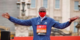 Runner-up, Kenya's Vincent Kipchumba poses with his trophy in front of Buckingham Palace after the elite men's race of the 2020 London Marathon in central London on October 4, 2020.