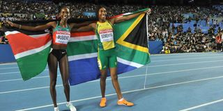 Kenya's Janeth Jepkosgei Busienei (L) and South Africa's Caster Semenya celebrates taking bronze and silver in the women's 800 metres final at the International Association of Athletics Federations (IAAF) World Championships in Daegu on September 4, 2011.