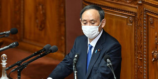 Japan's Prime Minister Yoshihide Suga delivers his policy speech at the lower house of parliament in Tokyo on January 18, 2021.