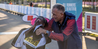 Sports events and athlete management company RunCzech's head Carlo Capalbo congratulates Kenya’s Peres Jepchirchir after she broke the world half marathon record at a special event organised by RunCzech in Prague on September 5, 2020.