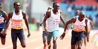 Reynold Cheruiyot (left) Brian Kemboi and Timothy Cheruiyot (right) deep to the finishing line 1500m finals on 22nd July 2025 during Athletics Kenya National Trials for World Championship at Ulinzi Sports Complex