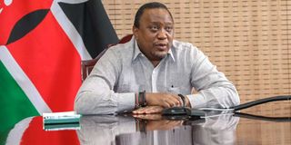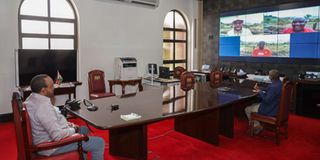 President Uhuru Kenyatta attends a virtual meeting with elite Kenyan marathoner Eliud Kipchoge from State House, Nairobi on August 8, 2020. The virtual meeting was convened by Tourism and Wildlife Cabinet Secretary Najib Balala and attended by Narok Governor Samuel Tunai.