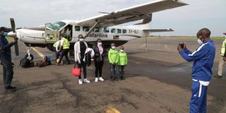 Olympic marathon champion and world marathon record holder Eliud Kipchoge (right) takes a photo of his family (wife Grace and children Lynne, Griffin and Jordon) at the Eldoret International Airport on their way to the Maasai Mara Game Reserve on August 8, 2020.