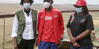 Olympic marathon champion and world marathon record holder Eliud Kipchoge with Kenya Tourism Board CEO Betty Radier (left) and Kenya Wildlife Services chairperson Betty Maitoyo at the Maasai Mara Game Reserve on August 8, 2020.