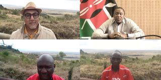 A screen grab of (clockwise from above, right) President Uhuru Kenyatta, world marathon record holder Eliud Kipchoge, Narok Governor Samuel Tunai and Tourism Cabinet Secretary Najib Balala during the launch of the sports tourism campaign on August 8, 2020. President Kenyatta was speaking from State House, Nairobi, while Kipchoge, Tunai and Balala were at the Maasai Mara Game Reserve.