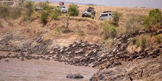 Tourists flock the Maasai Mara Game Reserve to witness the wildebeest migration on August 8, 2020.