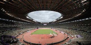 The Japan National Stadium is illuminated for the evening before the World Athletics Championships at the Japan National Stadium in Tokyo, Japan.