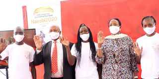 From left: Athlete Leonard Bett, Olympian Kipchoge Keino, athlete Mary Moraa, Sports CS Amina Mohamed and athlete Mercy Cherono during the launch of the Kip Keino Classic on September 21, 2020 at Riadha House in Nairobi.