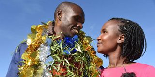 Vincent Kipchumba (left), who finished second in London Marathon, with his wife Olive Chepsiror, on arrival at Eldoret international Airport on October 6, 2020.