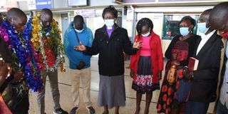 Vincent Kipchumba (second left), who finished second in London Marathon, Benson Kipruto (left), who finished seventh, Kipchumba’s wife Olive Chepsiror third (right), Kipchumba’s mother Leah Kogo second (right), Pastor Bernadette Sawe (centre), friends and relatives say a word of prayer when the athletes arrived at Eldoret international Airport on October 6, 2020.