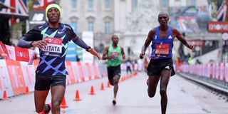 Ethiopia's Shura Kitata (left) beats Kenya's Vincent Kipchumba (right) and compatriot Sisay Lemma at the finish of the elite men's race of the 2020 London Marathon in central London on October 4, 2020.