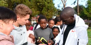 World marathon record holder Eliud Kipchoge (right) signs running shoes for pupils from Kenton School, Nairobi who watched him training at Moi University in Eldoret, Uasin Gishu County on April 4, 2023.