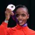 Silver medallist Kenya's Faith Kipyegon celebrates with her medal on the podium in Japan.