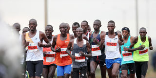 Ronald Kimeli Kurgat (centre) in the leading pack during the men's 42km race during the Standard Chartered Bank Nairobi Marathon on October 27, 2024 at Uhuru Gardens.