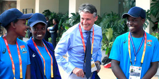 World Athletics president Seb Coe with young volunteers during the World Under - 18 Championships in Nairobi in 2017.
