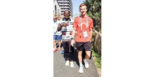 Former Kenya rugby international Oscar Dennis (right) with para cyclist Kennedy Ogada at the Paris Paralympic Games Athletes’ Village on August 27, 2024.