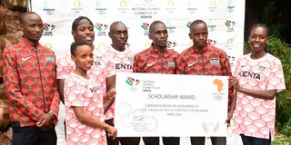 From left: athletes Charles Simotwo, Beatrice Chebet, Ferdinand Omanyala, Abel Kipsang, Nicholas Kimeli, Jacob Krop and Margaret Chelimo pose with a cheque after they received scholarships from the Association of National Olympic Committee of Africa during a function at Noble Hotel in Eldoret town, Uasin Gishu County on October 04, 2022. The funds will help them prepare for the 2024 Olympics.