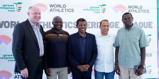 From left: World Athletics Heritage Director Chris Turner, two-time Boston Marathon champion Moses Tanui, Ethiopia's athletics legend Haile Gebrselassie, Moroccan-born American Khalid Khannouchi and former 3,000m world record holder Daniel Komen pose for a picture in Addis Ababa National Museum on November 20, 2025.