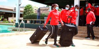 Fom left: National Realy team members Monica Safania, Maximilla Imali (centre) and Susan Nyambura at Moi International Sports, Centre, Kasarani, on April 27 2021.