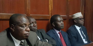 Stephen Soi, Harun Komen Chebet, former Sports PS Richard Ekai and former CS Hassan Wario at a Milimani court on January 22, 2019 over the Rio Olympics.
