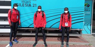 Nusra Rukia (left), Michael Musyoka (centre) and Vanice Kerubo moments after completing their warm up session in Silesia, Poland on April 29, 2021. The three will be participating in the shuttle relay.