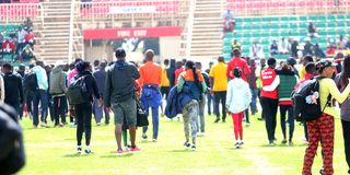 Kenyan athletes walk off the Nyayo stadium pitch after refusing to compete in the African Games trials over quota issues on March 5, 2023.