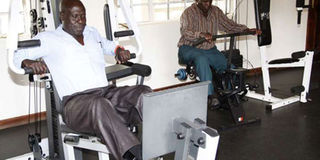 Team Kenya's coaches Julius Kirwa (left) and John Mwithiga inspect equipment inside a gym at the High Performance Training Centre, Kazi Mingi Farm, in Eldoret on July 4, 2016 where athletes will be training for the Olympic Games. PHOTO | JARED NYATAYA |
