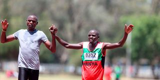 Bernard Munang’at (right) celebrates with his guide Andrew Chemobo after winning the men’s 5,000m T11 title at the National Para Athletics Championships at Kenyatta University on January 29, 2025.