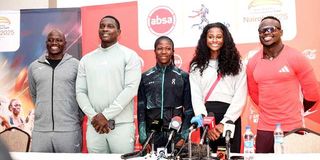 Star athletes, from left, Julius Yego (Kenya, javelin), Anderson Peters (Granada,javelin), Sarah Moraa (Kenya, 800m) Maia McCoy (USA, 100m) and Ferdinand Omanyala (Kenya, 100m) at Absa Kip Keino Classix press conference at Tamarind Tree Hotel, Nairobi on May 30, 2025.