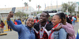African 100m champion Ferdinand Omanyala (centre) takes a selfie with fans at the Jomo Kenyatta International Airport on June 13, 2022 after Team Kenya arrived from Mauritius where they took part in the Africa Senior Athletics Championships.