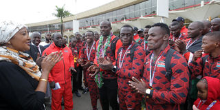 Cabinet Secretary for Sports Amina Mohamed was at hand with bouquets of flowers amidst songs and dances to receive the team of 56 athletes and 20 officials that landed at 11.30am aboard a chartered Kenya Airways plane.