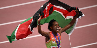 Kenya's Faith Kipyegon celebrates after winning the World Athletics Championships women's 1,500m final at Japan National Stadium, Tokyo, on September 16, 2025.