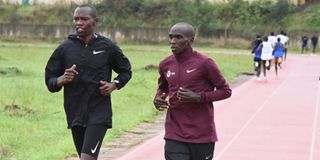 Victor Chumo (left) and world Marathon Record holder Eliud Kipchoge train at the Kipchoge Keino Stadium in Eldoret town, Uasin Gishu County on September 8, 2020.