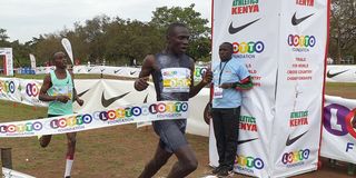 Emmanuel Wanyonyi wins the men's 2km race during the national trials for the World Cross Country Championships in Ruiru on December 10, 2022.