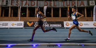 Ethiopia's Letsenbet Gidey (right) follows Kenyan pacemaker Beatrice Chepkoech and the wavelight pace lights on her way to breaking the 5000m world record in Valencia on October 7, 2020.