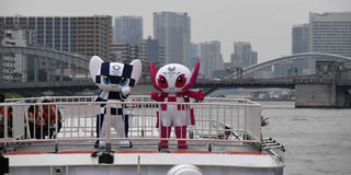 Tokyo 2020 Olympics Games mascots Miraitowa (left) and Someity ride on a boat during a parade in Tokyo on July 22, 2018.